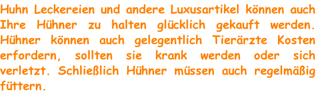 Abständen. Hühner erfordern eine anfängliche Aufwand an Geld für ihre Gehäuse und Schutz, sondern kann dann relativ geringen Kosten zu einem Hund oder einem Pony verglichen werden. Ausrüstung für die Fütterung und Trinken kann Einkauf und Ersatz von Zeit zu Zeit in Anspruch nehmen.