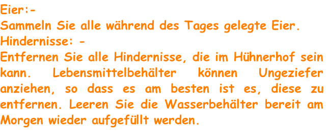 Schließen Sie Ihre Hühner in ihrem Haus in der Dämmerung, wenn sie in gegangen sind, rächt. Der Zeitpunkt dieser variiert je nach Saison. Dies wird am frühen Nachmittag im Winter und am späten Abend im Sommer sein.