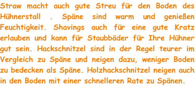 Zerrissenes Papier jedoch kann eine preiswerte Alternative für ein Einbettungsmaterial sein. Hay ist wenig Verwendung für ein Einbettungsmaterial ist aber gut für die Nistkästen. Hay hat schlechte Entwässerungseigenschaften und bietet keine gute Kratzmaterial für Ihre Hühner. Straw hat eine bessere Entwässerung als Heu und ist ein gutes Material für Ihre Hühner in kratzen herum.
