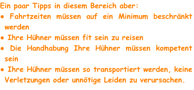Bitte erkundigen Sie sich bei den örtlichen Behörden den neuesten Vorschriften für Aufbewahren und Transportieren von Hühnern.