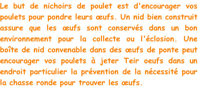 Les nids sont très importants pour les poulets et peuvent également varier considérablement dans le prix. Les nids doivent être accueillant pour vos poulets, et doit être gardé propre et bien lits pour minimiser l'encrassement des oeufs.