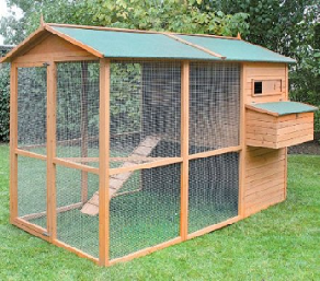 Grand poulailler d'extérieur parfaitement équipé. En bois traité, il convient pour un parquet de poules naines ou de grande race. De tout confort, il comprend une volière couverte avec perchoir, un abri avec 2 perchoirs et 2 trappes de ventilation coulissantes et un pondoir à 3 compartiments. Très pratique, il possède un grand tiroir de nettoyage en tôle galvanisée et de nombreux accès : une porte pour la volière, une trappe coulissante pour l'accès des poules à l'abri, une grande porte dans la volière et une sur l'arrière pour l'accès à l'abri pour le nettoyage ou le contrôle des animaux. De plus, le pondoir est accessible de l'extérieur pour pouvoir ramasser les oeufs sans affoler les poules. Toiture en toile goudronnée. Grillage maille soudée 25 x 25 mm. Livré en kit. Capacités : 8 à 12 poules Dimensions au sol : 259 x 143 cm Dimensions hors tout