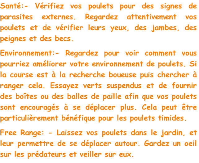 Clair:- Sortez les excréments et la litière souillée du poulailler et courir. Portez une attention particulière à la boîte à nid. Une boîte de nid propre signifie oeufs propres!